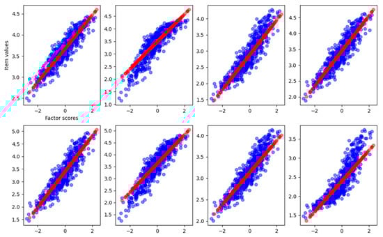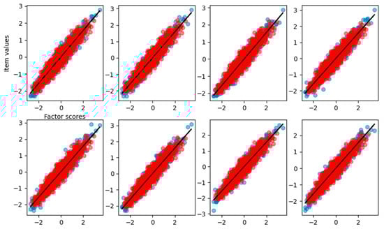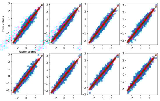 Graphical representation of the relationship between the factor scores and the eight-item values as reconstructed from the VAE and the FA. Blue dots are the VAE reconstruction, and red points are the reconstruction from factor analysis.