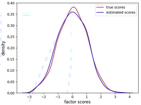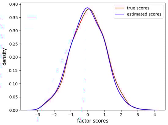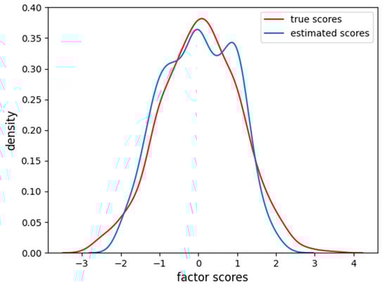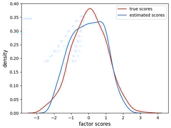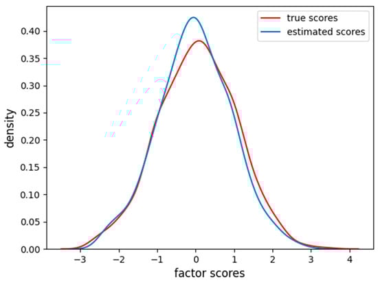 We can see that the last item–factor relationship, represented by the FA with a linear function, does not capture the correct relation. The fitting curve is not reported because it is not possible to perform the fit between a linear data reconstruction and a nonlinear sigmoidal curve. The explained variance is still pretty high, 0.88, but lower than before. In Figure 7 is reported the density of estimated factor scores and the true scores density. We can see that the estimation still resembles the true Gaussian distribution (MAE = 0.16, RMSE = 0.20) also if an item is wrongly reconstructed.