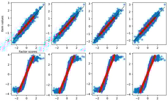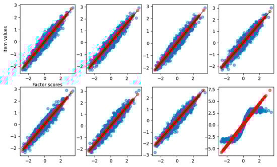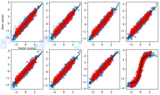 Graphical representation of the relationship between the factor scores and the eight-item values for the VAE reconstruction of the linear dataset. Blue dots are the true item values, red points are the reconstruction from factor analysis, and the black solid line is the result of the curve fitting.