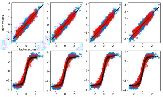 Graphical representation of the relationship between the factor scores and the eight-item values for the FA reconstruction of the linear case dataset. Blue dots are the true item values, red points are the reconstruction from factor analysis, and the black solid line is the result of the curve fitting.