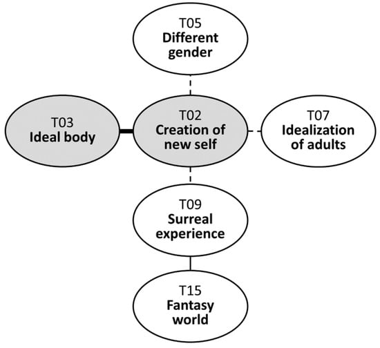 Physical appearance ideals are reflected in avatar creation precisely because the ideal is easily attainable in the virtual world. Zepeto allows users to engage in activities they would not be able to experience in reality (T09). As one interviewee mentioned, “You cannot change your height in reality” even though you “think a shorter height looks cuter” or vice versa. Another example would be age; although most of the interviewees chose to make their avatars look similar in age to themselves, a few of them preferred to create avatars that appeared older. This tendency was shown with an idealization of adults (T07), as they noted that “people in their 20s seem to enjoy more freedom with their lives”. A few participants also expressed interest in trying out a male gender avatar (T05), since the virtual world allows users to embody their imagination (“I have wondered how it would feel to be a boy and hang out with other boys”). The functionalities of virtuality, which enable users to change the height, skin color, gender, or age with just one click, seem to encourage adolescents to experiment with appearances that differ from their real-life selves. This reinforces the users’ perception that Zepeto is a fantasy world distinct from reality (T15). The relevant section of the map is depicted in Figure 3.