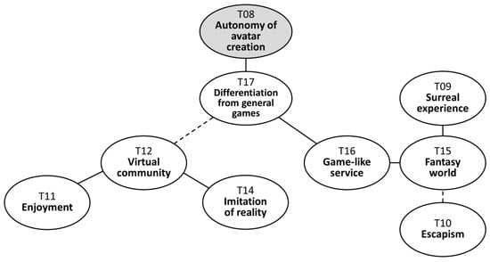 Another motivation underlying the preference for same-gender avatars was that “you can vicariously satisfy yourself by putting on various styles you wanted to wear in real life”. This motivation was closely linked to the autonomy of avatar creation afforded by Zepeto platform (T08). Given the freedom to customize their avatars, users could fully leverage Zepeto as a space for self-expression, extending their identities into the virtual world through avatars described as “a Zepeto version of me” or “another me in Zepeto”. Yet, financial constraints (T13) faced during the avatar creation process could hinder the realization of this autonomy. Further elaboration on this topic will be provided in a subsequent section. Figure 2 shows the relevant portion of the map.