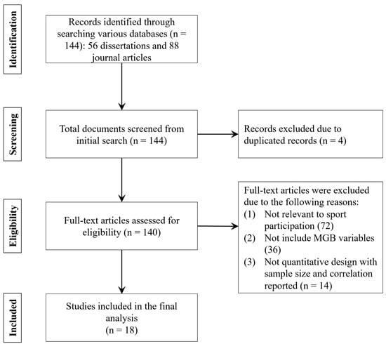 The search strategy for relevant studies was conducted following the guidelines of Preferred Reporting Items for Systematic Reviews and Meta-Analyses (PRISMA), which includes identification, screening, eligibility assessment, and study inclusion []. First, we searched for relevant studies published in Korean and English using various databases, including the National Assembly Digital Library (http://dl.nanet.go.kr), academic research information service (http://www.riss.kr), and Korean academic information (http://kiss.kstudy.com). As this study targeted the research context in Republic of Korea, these major academic databases in Republic of Korea were chosen. Moreover, these databases also include studies published in English and Korean. Therefore, it allows researchers to identify both English and Korean studies conducted in the context of Republic of Korea. More specifically, following Chiu and Cho’s [] strategy, we searched relevant literature by using the combination of the following keywords: “model of goal-directed behavior” AND “sport”, “model of goal-directed behavior” AND “physical activities”, as well as “model of goal-directed behavior” AND “sports participation”. As a result, a total of 144 articles (56 articles from dissertations and 88 articles from journals) were retrieved from the initial search. Moreover, throughout the screening process, four studies were excluded due to the duplicated records. Next, 140 studies were evaluated during the eligibility process according to the following criteria: (1) studies must be relevant to sports participation. (2) Studies must use MGB as the theoretical framework and include all/partial MGB measures; (3) studies must have a quantitative design that includes both sample size and correlation. In addition, estimation of effect size requires both sample size and correlation; therefore, only quantitative studies with both sample size and correlation coefficients were considered for inclusion in the meta-analysis. As a result, 14 studies were excluded due to the missing information on sample size or correlation. Consequently, 18 studies were included, covering 5772 Korean respondents. Figure 2 depicts a flow chart outlining the study selection process.
