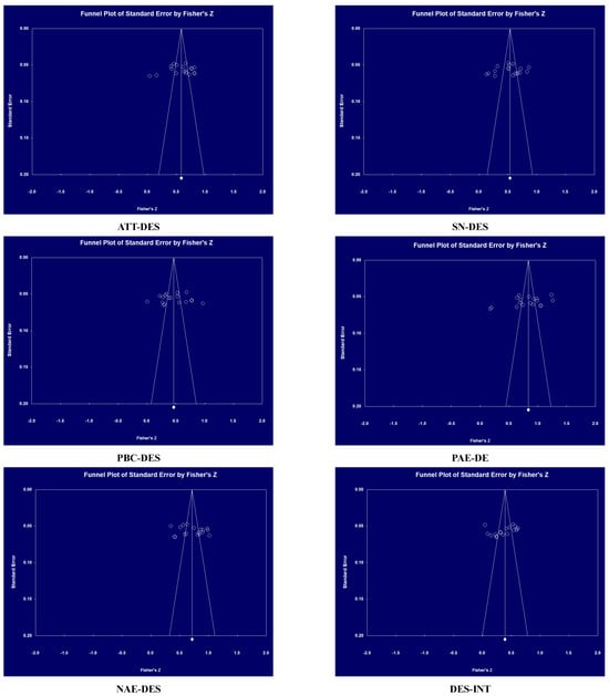 The results of the meta-analysis of the six pairwise correlations with the MGB are reported in Table 1. A random effects model was examined for the effect sizes of all the correlations. Table 1 showed that all pairwise relationships were significant, ranging from 0.361 to 0.671 (p < 0.001). Specifically, the DSE–INT correlation showed the most substantial effect size (0.671), followed by PAE–DES (0.619) and ATT–DES (0.525), both indicating strong effect sizes []. Moreover, the correlations of SN–DES (0.486), PBC–DES (0.435), and NAE–DES (0.361) showed moderate effect sizes [].