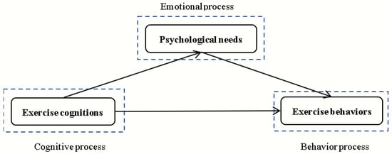 Cognition, a term rooted in psychology, refers to the process of acquiring knowledge or understanding [6]. Exercise cognition specifically pertains to our understanding of physical movement and includes beliefs about the benefits and barriers associated with physical exercise [7]. Generally, exercise cognition serves as the foundation for exercise consciousness and one’s capacity to act, where increased knowledge and understanding contribute to the development of higher-level exercise consciousness, thereby facilitating exercise behaviors [8]. Previous research has indicated a positive association between individual exercise cognition and exercise behaviors [9,10]. Those with more exercise-related cognitive errors tend to exercise less [11]. Additionally, a prior study has found that cognitive processes in exercise mediate the relationship between visual perception and proficient action [12]. This explains why elite athletes can circumvent information processing limitations when performing complex exercise skills. In summary, exercise cognition is widely considered a significant factor influencing exercise behaviors [13]. However, previous studies have paid less attention to adolescents’ exercise cognition, particularly regarding its impact on their exercise behaviors. Therefore, we posit the following: