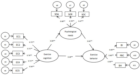 To evaluate the direct, indirect, and overall effects of adolescents’ exercise cognition and basic psychological needs in exercise and exercise behaviors, a path analysis was conducted on the established SEM (see Table 5 and Figure 2).