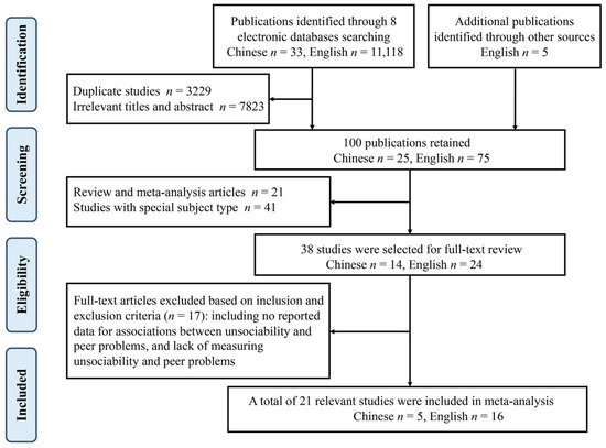 To retrieve relevant research on the associations between unsociability and peer problems interested in the present study, a systematic search was performed at the initial stage of study selection in various electronic databases: EBSCO, Sage, Science Direct, Springer Online Journals, Willey, China National Knowledge Infrastructure (CNKI), China Master’s Theses Full-text Database (CMFD), and the China Doctoral Dissertations Full-text Database (CDFD). Then, we manually checked the reference lists of selected studies and reviewed articles to reduce the likelihood of missing relevant studies.