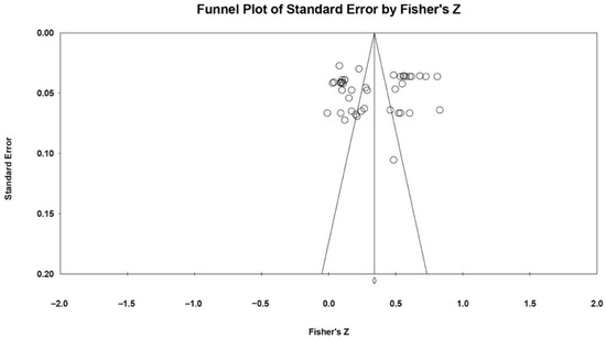 In order to assess whether there was publication bias, the visual inspection of the funnel plot revealed an absence of publication bias (see Figure 2). In addition, the regression coefficient of Egger’s test (b = −1.97, SE = 3.36, 95% CI = [−8.76, 4.81], t(41) = 0.59, p = 0.560) and the rank correlation coefficient of Begg’s test (Z = 0.36, p = 0.722) were non-significant, and the Fail-Safe N test showed that 26,233 additional studies of the associations between unsociability and peer problems would be required to change the significant overall effect size in the present meta-analysis, which was larger than the 5k + 10 limit [60]. Thus, there was no statistically significant publication bias in the selected studies.