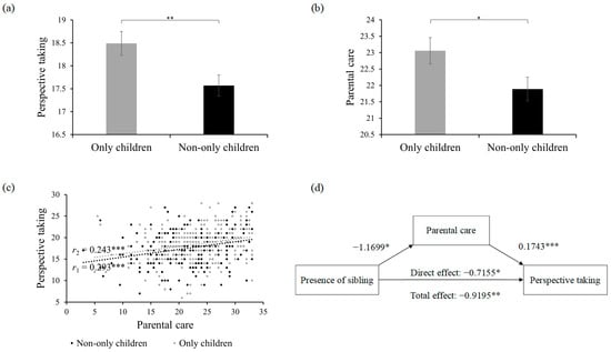 (a) Perspective-taking scores for only children and non-only children groups. (b) Perceived parental care for only children and non-only children groups. (c) Correlations between perspective-taking and parental care for only children (gray dots) and non-only children (black dots). (d) Mediation role of parental care on the association between presence of sibling(s) and perspective-taking. The error bars represent standard errors. * p < 0.05, ** p < 0.01, *** p < 0.001.