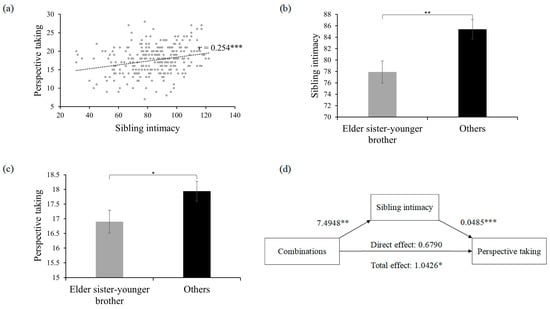 (a) Correlation between perspective-taking and sibling intimacy. (b) Sibling intimacy for the elder sister–younger brother group and other combinations. (c) Perspective-taking for elder sister–younger brother group and other combinations. (d) Mediation role of sibling intimacy on the association between sibling combinations (i.e., elder sister–younger brother combination vs. other combinations) and perspective-taking. The error bars represent standard errors. * p < 0.05, ** p < 0.01, *** p < 0.001.