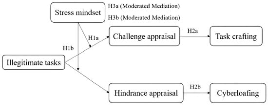 To fill this gap, this study examines when and why employees differ in their reactions to illegitimate tasks. Given the variations in how individuals interpret these tasks, it is crucial to consider the boundary conditions of individual differences in the relationship between illegitimate tasks and subsequent outcomes. Drawing on the transactional theory of stress, we investigate the conditions under which illegitimate tasks can be conducive to personal growth and unpack the mechanisms through which illegitimate tasks affect employee behaviors. Illegitimate tasks can be a source of workplace stress because they offend individuals’ professional identity and threaten their self-view []. According to the transactional theory of stress, employees may appraise a singular stressor as either a challenge or a threat and engage in corresponding coping behaviors [,]. Individuals’ evaluation of a stressor is contingent upon its interaction with their stable characteristics. Individuals may appraise the same stressor differently, and these appraisals can affect how they respond to stress []. In this study, we introduce an important personality trait, the stress mindset, to explain why employees respond differently to illegitimate tasks. Stress mindset refers to the extent to which an individual believes that stress has either enhancing or debilitating consequences for stress-related outcomes such as personal growth, performance, and well-being []. Those who believe stress improves these outcomes hold a “stress-is-enhancing mindset”, while those who believe stress hinders these outcomes hold a “stress-is-debilitating mindset”. Individual mindsets serve to evaluate demanding situations that significantly affect how the individual perceives and responds to these demands. Additionally, previous research has found that individuals’ stress mindset affects their appraisal of stressful situations as well as the subsequent behavioral response [,,]. Thus, the stress mindset might shape the cognitive appraisal of illegitimate tasks and thus indirectly affect the coping behavior generated by the appraisal of illegitimate tasks. To further explore the behavioral response, task crafting and cyberloafing were selected as representative variables of approach and avoidance coping behaviors.