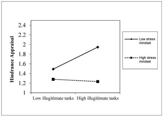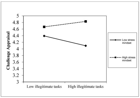The transactional theory of stress suggests that certain individual traits critically influence the cognitive appraisal process, determining the extent to which a stressor is appraised as promoting or thwarting elements of inherent value to the individual []. In a nutshell, differences in personality can lead to interindividual variations in stressor appraisal relationships [,,]. For example, compared with low-trait-resilient employees, employees with high trait resilience are more inclined to appraise the performance pressures as challenging []. This study posits that illegitimate tasks and employees’ stress mindset interact to predict cognitive appraisal of illegitimate tasks.