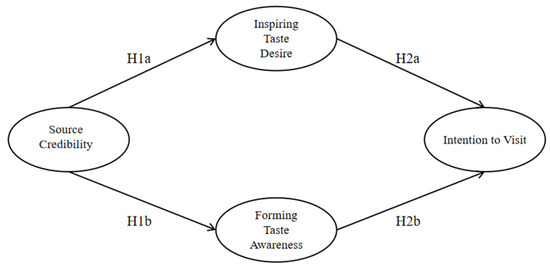 Intention to visit is typically defined as consumers’ potential decision or inclination to participate in, experience, or visit a specific place or activity [54]. It is a critical factor in predicting consumer behavioral intentions and is seen as a bridge between actual behavior and psychological attitudes [55]. According to information processing theory [56], when consumers encounter certain stimuli, such as recommendations from a food exploration blogger, they undergo a series of reception, encoding, storage, and retrieval processes. These processes ultimately form cognitions and evaluations of food or restaurants. In this process, the characteristics of the blogger, especially their credibility, significantly influence the formation of the audience’s intention to visit. When consumers perceive an information source as highly credible, they are more likely to be influenced by the information and take action [57].
