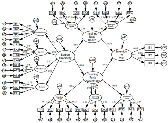 Source credibility also significantly positively predicts the forming taste awareness variable (β = 0.84, p < 0.001), thus confirming hypothesis H1b. Trustworthiness, expertise, attractiveness, and similarity strongly correlate with the various dimensions of forming taste awareness. Specifically, the correlations include trustworthiness with providing image (r = 0.59, p < 0.01), delivering knowledge (r = 0.46, p < 0.01), and presenting guides (r = 0.45, p < 0.01); expertise with providing image (r = 0.70, p < 0.01), delivering knowledge (r = 0.57, p < 0.01), and presenting guides (r = 0.56, p < 0.01); attractiveness with providing image (r = 0.61, p < 0.01), delivering knowledge (r = 0.56, p < 0.01), and presenting guides (r = 0.56, p < 0.01); and similarity with providing image (r = 0.63, p < 0.01), delivering knowledge (r = 0.56, p < 0.01), and presenting guides (r = 0.54, p < 0.01). These results indicate that trustworthiness, expertise, attractiveness, and similarity are crucial in shaping the audience’s imagination and understanding of culinary locations by providing rich, relatable content that resonates with viewers.