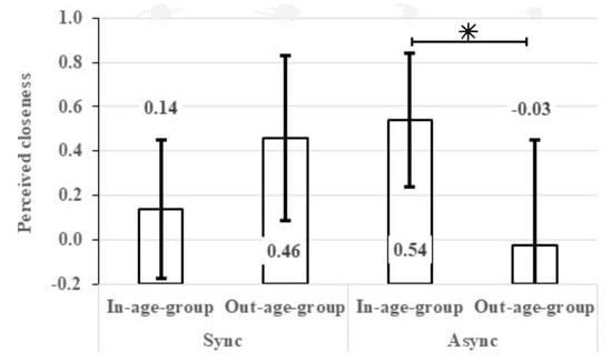 Change in perceived closeness between generations: interaction of synchronization condition and in/out-age-group. Note: The asterisk indicates the significant difference (p = 0.020) between the in-age-group and the out-age-group within the asynchronous condition based on multiple comparisons with a Bonferroni correction. The participants who moved out of synchrony with members of a different age-group showed a negative perceived closeness between generations, compared with the participants who moved out of synchrony with their in-age-group members.