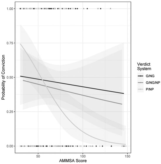 Next, it was important to test whether a model containing the predictor variables (verdict systems and the AMMSA score) could reliably predict conviction and acquittal verdicts. The interaction between verdict systems and the AMMSA scale was also included in the model. A Likelihood-Ratio Test between the model with and without interaction was significantly in favour of the model with interaction (LR Test χ2 (2) = 7.54, p = 0.023). The Anglo-American verdict system (guilty and not guilty) was selected as the reference category (as it is the most common system used in the world), meaning the special verdict system (proven and not proven) and the Scottish verdict system (guilty, not guilty and not proven) were compared with the Anglo-American verdict system.