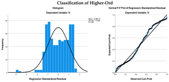 The quantitative analysis variables (independent or predictive variables) should exhibit a multivariate normal distribution [61,62]. Thus, the normal distribution of the continuous variables was investigated with histograms and p–p graphs. The results are presented in Figure 1.