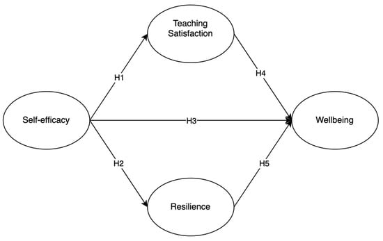 Recent studies have examined the relationships between teachers’ self-efficacy and various outcomes in the educational context. Research indicates that higher levels of self-efficacy are associated with better student outcomes, greater job satisfaction, and lower levels of burnout among teachers [14,15]. Studies also suggest that self-efficacy can influence a teacher’s resilience, enabling them to cope more effectively with the stresses and demands of the profession [16,17]. For example, teachers with high self-efficacy are more inclined to perceive challenges as avenues for growth and development rather than as insurmountable barriers [18]. Finally, self-efficacy has been linked to overall well-being, encompassing emotional, psychological, and social aspects of teachers’ lives [19]. Based on these findings, the following hypotheses are proposed: