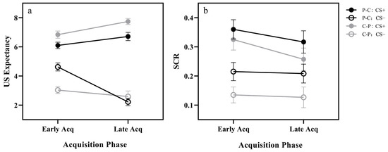 US expectancy and skin conductance response. (a) Unconditioned stimulus (US) expectancy and (b) skin conductance response (SCR) during early and late acquisition (Acq). P–C = partial followed by continuous CS–US pairings; C–P = continuous followed by partial CS–US pairings. Error bars indicate the standard error of the mean.