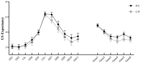 Unconditioned stimulus (US) expectancy of P–C and C–P groups under different stimulus types and generalization phases (Note: GS1–GS11 refer to different stimulus types in the generalization phase; Gene1–6 refer to 6 blocks in the generalization phase).
