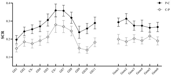 Further analyses revealed that on Gene1, for GS2, CS−, GS4, GS8, GS10, and GS11, the SCR was significantly higher in the P–C group than in the C–P group (ps < 0.05). For GS4, GS5, GS7, and GS10 on Gene2, the SCR was significantly higher in the P–C group than in the C–P group (ps < 0.05). For GS9 and GS11 on Gene3, the SCR was significantly or marginally significantly higher in the P–C group than in the C–P group (ps < 0.055). For GS5 on Gene4, the SCR was higher in the P–C group than in the C–P group (p = 0.002). Meanwhile, in the P–C group, the SCR for GS5, CS+, GS7, and GS10 was higher than CS− on Gene2 (ps < 0.05), and for CS+ and GS8 was significantly or marginally significantly higher than CS− on Gene4 (ps < 0.073); the SCR for GS5, CS+, GS7, and GS8 was higher than CS− on Gene5 (ps < 0.05). In the C–P group, the SCR for CS+ and GS7 on Gene1 was higher than that for CS− (ps < 0.05), and for CS+ and GS8 on Gene4 was significantly or marginally significantly higher than that for CS− (ps < 0.059); the SCR for GS4, GS5, CS+, and GS7 on Gene5 was significantly greater than CS− (ps < 0.05).
