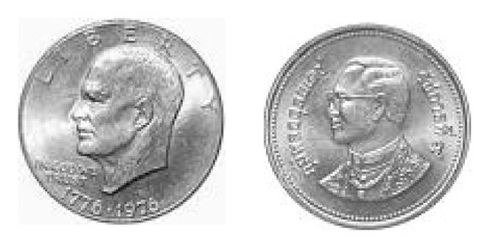 The coins used in Experiment 1. The left picture was the back side of one dollar, and the right picture was the back side of one yen. Color should be used for this figure in print.