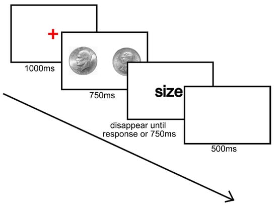 All experiments were programmed using Psychtoolbox in MATLAB 2018b. Participants performed the task in individual booths, where they sat approximately 50 cm from the computer screen. Prior to the experiment, participants were explicitly informed and learned which coin portrait was higher in value. The experiment procedure of Experiment 1 is displayed in Figure 2. Each trial began with a red fixation for 1000 ms, followed by the display of two coins for 750 ms. After the disappearance of the coins, a cue word, either “size” or “value”, was presented on the screen to probe the participant to respond to the coins by pressing the key ‘J’ or ‘F’. Pressing ‘J’ indicated that the coin on the right side was larger in “size” or “value”. Pressing ‘F’ indicated that the coin on the left side was larger in “size” or “value”.
