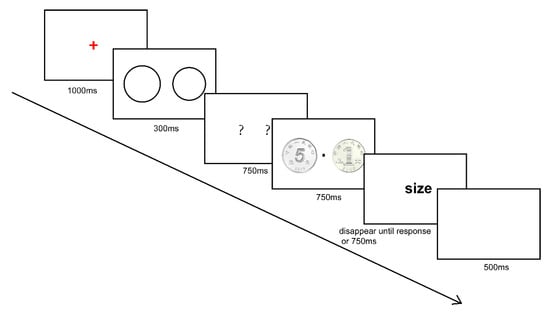 In each trial, a red cross fixation was displayed in the center of the screen for 1000 ms. Then, two circles of different size appeared at the left and right side for 300 ms, followed by two masking stimuli for 750 ms. After this, two coins were presented in the same position as the circles for 750 ms. Lastly, a cue word was shown for 750 ms, which instructed participants to make reactions by ‘size’ or ‘value’. The ‘size’-asked participants to select the circle of larger size by pressing the keys ‘J’ or ‘F’, and the ‘value’-asked participants to select the circle associated with higher value. Pressing ‘J’ meant that the right circle was larger in size or higher in associated value. Pressing ‘F’ implied that the left circle was. Participants were allowed to make their response from the presentation of the cue word. The cue word would disappear either after the participant pressed the key or 750 ms had passed. Followed by the cue word, a blank screen would be presented for 500 ms, implying an upcoming trial.