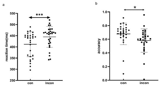 Behavioral performances of (a) mean reaction time; (b) accuracy. * indicates p < 0.05, and *** indicates p < 0.01.