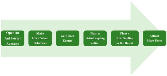 Meanwhile, with the combination of green finance theory and Internet technology, many innovative green finance practice products have emerged. Among the many green financial products, Ant Forest adopts an innovative “public welfare + gamification” model, applying it to the product and balancing public welfare value with market economic value [25]. It quantifies the carbon emission reductions from users’ green consumption behaviors into digital measurements, forming users’ exclusive carbon accounts, encouraging everyone to contribute to energy conservation and emission reductions through their carbon account platforms [26], and converting them into carbon assets through financial means, effectively promoting the development of personal carbon finance products in green finance [27]. Therefore, many scholars have studied Ant Forest as an innovative practice for successful green financial products [28,29].