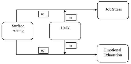 Although stress and burnout in the workplace are considered precursors to negative experiences in many workplaces, it is emphasized that the leadership process is not sufficiently focused during the solution phase [54,55]. Additionally, while job demands and resources play an essential role within the organization, they may vary based on specific job characteristics. When the extant literature is examined, burnout and job stress research has mainly focused on determining the prevalence of burnout and stress and understanding the impact of demographic and organizational characteristics on these variables. However, there is a research gap in terms of addressing burnout and job-stress management from an organizational perspective, especially in terms of investigating the impact of emotional labor on burnout and stress in leader–member relations among healthcare professionals (not only nurses, but also doctors, secretaries, etc.) in a comprehensive manner. Certain work environment characteristics (e.g., compensation or role) and certain psychosocial variables (e.g., psychological capital, core self-evaluations, social and emotional intelligence) are generally considered moderator variables [56,57,114]. The sole study available during the literature review determined that LMX moderated the impact of emotional labor on burnout, thereby reducing nurses’ negative experiences [115]. However, it is acknowledged that the study has limitations in understanding the relationship between emotional labor, burnout, and Leader-Member Exchange (LMX) due to its small sample size of 165 nurses and focus solely on nurses. More research on this subject is needed. In this context, the aim is to investigate the moderator role of LMX in mitigating the impact of surface acting, which results from high job demands experienced by healthcare professionals on job stress and emotional exhaustion. This is intended to contribute to developing sustainable public health management practices. Based on the existing literature and theories of Emotion Regulation, Job Demands-Resources (JD-R), and the Conservation of Resources (COR), the following hypotheses were formulated to examine the effect of LMX as an essential organizational resource in reducing negative workplace experiences, such as surface acting, job stress, and emotional exhaustion, which deplete the resources of healthcare professionals in a high-demand environment. The research model is depicted in Figure 1.