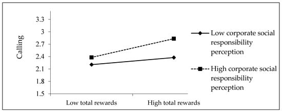 To prevent collinearity issues associated with testing interaction terms, cross-multiplicative terms involving total rewards, calling, and CSR perception were constructed through centering and subsequently incorporated into the regression analysis. As can be seen from Model 3 in Table 3, there is a significant interaction between total rewards and CSR perception (β = 0.154, p < 0.05).