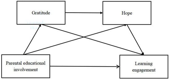 Although no research has directly demonstrated the chain-mediating role of gratitude and hope in the relationship between parenting involvement and students’ learning engagement, based on the literature review above, we learned that the variables in this study are interrelated. Based on the theoretical frameworks and related research of the developmental–ecological model of student engagement and the family investment model [,], students’ learning behaviors are subject to multiple influences, such as individual psychology and the external environment. Meanwhile, gratitude and hope may play a bridging role in the relationship between parental educational involvement and students’ learning engagement [,,,]. Hope theory and the broaden and build theory of gratitude also support the positive effects of gratitude and hope on learning engagement [,]. However, few studies have incorporated both gratitude and hope into research models. In conjunction with empirical research on the temporal dimension of the positive psychological traits model [], gratitude is believed to promote hope, and the emotion and disposition of gratitude promotes students’ motivation and enthusiasm for learning and being hopeful. Therefore, this study will test a chain mediation model to examine the association between parental educational involvement and students’ learning engagement among middle school students, while also analyzing the mediating effects of gratitude and hope in an integrative way. The proposed model is illustrated in Figure 1.