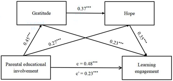 The chain-mediating role of gratitude and hope in the relationship between parental educational involvement and learning engagement. Note. *** p < 0.001.