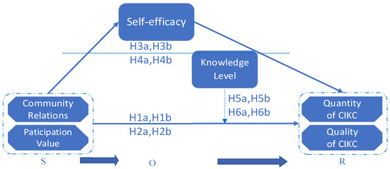 In sum, the stimulus that can trigger user behavior and response in the community ultimately affects the continuous innovative knowledge contribution (quantity and quality) of users through influencing user self-efficacy in open innovation communities. Thus, we constructed a SOR model in which community relations and participation value were seen as stimuli, and self-efficacy as recognition by the organism, and continuous innovative knowledge contribution as response. Although there was a lot of research on the factors of the knowledge contribution in virtual communities, few of them had studied the mediation mechanism of the self-efficacy of users in an OIC, and we intended to fill this blank in research.