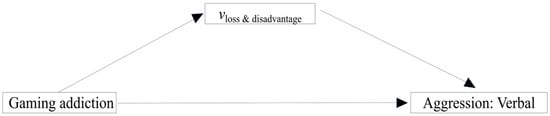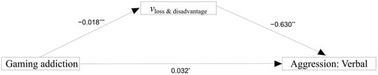 The results of the model with other dimensions of aggression as dependent variables showed that vloss & disadvantage did not mediate the relationship between gaming addiction and other aggression. This is the same as our expectation that the relationship between gaming addiction and aggression is not generalized but requires a specific analysis of the form of aggression. Due to the specificity of verbal aggression [], more forms of post-game aggression are now shifted to verbal aggression. This suggests that there is no direct role relationship between gaming addiction and other forms of aggression. Gaming addiction does not directly cause the likelihood that individuals will engage in other forms of actual aggressive behavior. This result also warns us that more attention needs to be paid to the mental health of individuals with gaming addiction to reduce the development of verbal aggression.