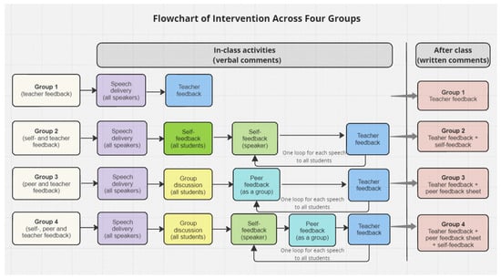 The intervention spanned four weeks, during which all students were required to prepare four 3-min speeches on four distinct topics (one for each week) and deliver one speech in class, with six students delivering their speeches in class each week due to the class’s time constraints. While each student was individually critiqued on their classroom presentation for once, the feedback was given to the entire class during the plenary session, focusing on four distinct topics to foster vicarious learning [19,35]. After students delivered their speeches, which were video-recorded using a Logitech C930e business webcam connected to a laptop to replay during feedback [19], the four intact classes were randomly assigned to the four feedback conditions: (1) teacher feedback, (2) self- and teacher feedback, (3) peer and teacher feedback, and (4) self-, peer, and teacher feedback (see Figure 1 for a flowchart of the intervention).