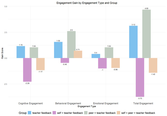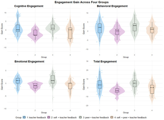 Significant differences were identified among the four groups in the pre-test: cognitive engagement (F(3, 94) = 2.77, p = 0.046, partial η2 = 0.081), behavioral engagement (F(3, 94) = 3.45, p = 0.02, partial η2 = 0.099), emotional engagement (F(3, 94) = 3.24, p = 0.007, partial η2 = 0.119), and total engagement (F(3, 94) = 3.79, p = 0.004, partial η2 = 0.133). Therefore, gain score ANOVA was conducted for identifying differences among the four groups in the changes from pre-test to post-test (see Appendix A.6 for descriptive statistics for the pre-test and post-test engagement across the four groups).