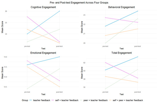 Table 4 presents the results of the paired sample t-test for engagement across four groups. Regarding cognitive engagement, a significant decline was observed in Group 2 (t(23) = −5.206, p < 0.001, Cohen’s d = −1.063). For behavioral engagement, a significant improvement was noted in Group 1 (t(24) = 2.22, p = 0.036, Cohen’s d = 0.444) and Group 3 (t(24) = 3.82, p = 0.001, Cohen’s d = 0.764). Emotional engagement showed a significant decline in Group 2 (t(23) = −4.796, p < 0.001, Cohen’s d = −0.979) and Group 4 (t(23) = −2.361, p = 0.027, Cohen’s d = −0.482), whereas a significant increase was revealed in Group 3 (t(24) = 2.279, p = 0.032, Cohen’s d = 0.456). Finally, total engagement significantly decreased in Group 2 (t(23) = −4.867, p < 0.001, Cohen’s d = −0.995) but showed a significant increase in Group 3 (t(24) = 3.697, p = 0.001, Cohen’s d = 0.739) (see Figure 3).