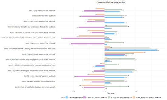 Specifically, regarding cognitive engagement, Group 1 and Group 3 made notable improvements in areas such as attention, comprehension, and reflection on feedback. They also reported better awareness of their strengths and weaknesses, as well as being more proactive in planning and monitoring their upcoming speeches. Similarly, Group 1 and Group 3 perceived an enhancement in emotional engagement, enjoying the feedback process, finding it useful, and anticipating it as opposed to the decrease in these aspects observed in Group 2 and Group 4. Behaviorally, all groups except Group 2 showed improvement by taking notes on the feedback, engaging in discussions out of class, revising their work, organizing the structure, and practicing speech delivery with Group 4 making the most revisions. However, except for Group 3, all other groups exhibited little improvement or even decreases in note-taking and searching for supporting evidence (see Figure 4 for responses to each item across groups).
