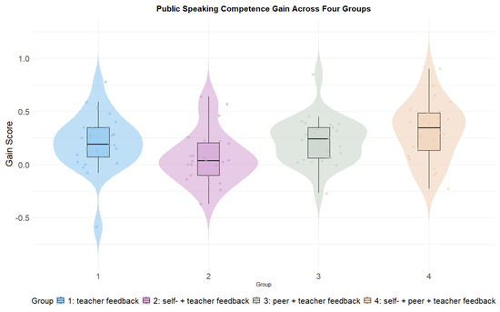 A significant difference was identified in the pre-test public speaking performance (F(3, 94) = 4.81, p = 0.004, partial η2 = 0.133), and therefore the gain score ANOVA was examined. The residuals of gain of students’ fair measures were normally distributed (skewness = 0.050, kurtosis = 0.888) and the variance was equal across groups (p = 0.621). (see Appendix A.6 for descriptive statistics for the pre-test and post-test public speaking performance). All four groups made improvements, with Group 4 (M = 0.31, SD = 0.28) being the best-performing group, followed by Group 3 (M = 0.22, SD = 0.22), Group 1 (M = 0.21, SD = 0.27), and Group 2 (M = 0.07, SD = 0.24). (see Figure 6).