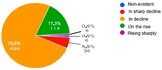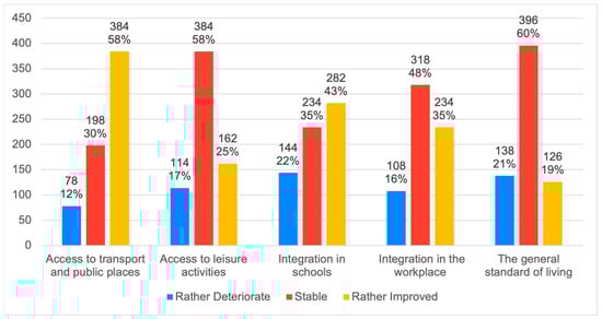 Figure 2 and Figure 3 provide encouraging insights into the possible evolution of this perception over time. Indeed, discrimination, identified by [] as a major factor of inequality and social exclusion, appears to be decreasing according to more than 75% of respondents (Figure 2). Furthermore, the level of inclusion of people with disabilities in different aspects of daily life seems to be stable in some areas (leisure and work) and improving in others (transport, public places, schools), with no signs of regression (Figure 3). This positive trend confirms the conclusions of [,], who observe a growing awareness of “minority groups” in society.