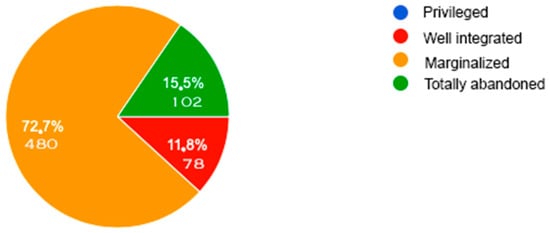 However, despite this perceived improvement, the progress made does not seem sufficient. The data in Figure 4 show that around 73% of the sample still feel that people with disability are marginalized and 15% feel that they are completely excluded. In addition, the information in Table 1, Table 2 and Table 3 shows that many situations still lead to their social exclusion. These results confirm the findings of [] on the widespread marginalization of people with disabilities and thus highlight the need for action to increase their social inclusion and consideration.