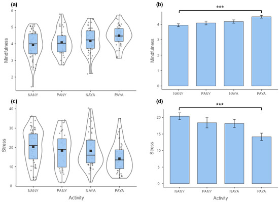 The distribution of scores and mean differences between samples of women (NANY, PANY, NAYA, and PAYA) in trait mindfulness and perceived stress are presented in Figure 1. The one-way ANOVA showed that the groups of women differ in trait mindfulness, F (3, 197) = 5.34, p = 0.001, = 0.08 (Figure 1a,b). In particular, the Bonferroni post-test showed that women practicing yoga for at least 150 min per week scored higher in trait mindfulness (PAYA) than non-physically active women (NANY) who did not practice yoga, ΔM = −0.55, S.E. = 0.14, t = −3.95, p < 0.001, Cohen’s d = −0.75. The group effect was also significant for perceived stress level, F (3, 197) = 4.92, p = 0.003, = 0.07 (Figure 1c,d). The sample of women who practice yoga for a minimum of 150 min per week showed significantly lower perceived stress levels than the non-physically active participants who did not practice yoga, ΔM = 6.19, S.E. = 1.62, t = 3.83, p < 0.001, Cohen’s d = 0.73.