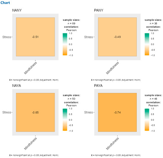 Pearson’s correlation between trait mindfulness and perceived stress in particular groups, depending on the type of activity (Yoga and physical activity). NANY = no active and no yoga, PANY = physically active and no yoga, NAYA = no active and yoga active, PAYA = physically active and yoga active.