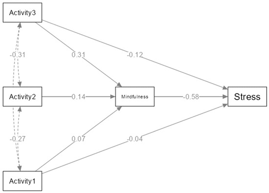 Mediation model for the indirect effect of activity type on perceived stress via trait mindfulness. Numbers represent standardized regression estimates (β). For the variable Activity, the contrasts are: Activity1 = PANY–NANY, Activity2 = NAYA–NANY, Activity3 = PAYA–NANY, where NANY = no active and no yoga, PANY = physically active and no yoga, NAYA = no active and yoga active, PAYA = physically active and yoga active.