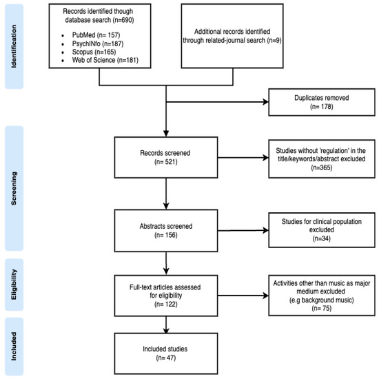 - Keywords: The authors used three main keywords for their search—“music”, “emotion”, and “regulation”—in various combinations using Boolean operations AND to identify relevant literature. These keywords helped narrow the search to articles specifically related to use of music for regulatory effect on music. By using “regulation” as a keyword, the authors distinguished studies focused on music emotion regulation (MER) from broader music emotion (ME) studies, which generally explore a wide range of emotional responses to music.