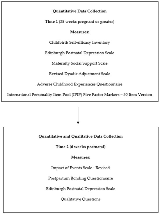 This study employed a mixed-method design. As can be seen in Figure 1, the quantitative component utilised a cross-sectional longitudinal design between 28 weeks pregnant (time 1) and six weeks postnatal (time 2), with 10 predictors (i.e., antenatal depression, childbirth self-efficacy, maternal social support, couple satisfaction, childhood trauma, and personality (i.e., emotional stability, conscientiousness, intellect, agreeableness, extraversion)) measured at time 1 and two dependent variables (i.e., birth-related PTSD symptoms and mother–infant relationship) and the co-variate of postnatal depression measured at time 2. The qualitative component asked two questions related to the participant’s birth experience and one about the connection with their baby in relation to their birth. The qualitative questions were asked at time 2.