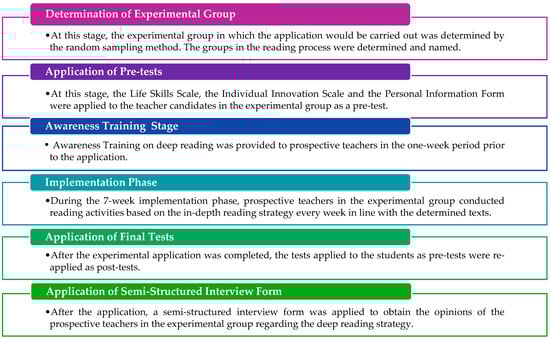 In the quantitative part of the study, a pre-test–post-test quasi-experimental design without a control group was used to examine the impact of the deep reading strategy on individual innovativeness and life skills. This experiment investigates the effect of experimental intervention through pre-tests and post-tests applied to the same groups before and after the intervention [,]. In this study, the experimental intervention was the close reading strategy, and the individual innovativeness and life skills of preservice Turkish language teachers were intervened. The stages of the experimental intervention used in the study are shown in Table 1.