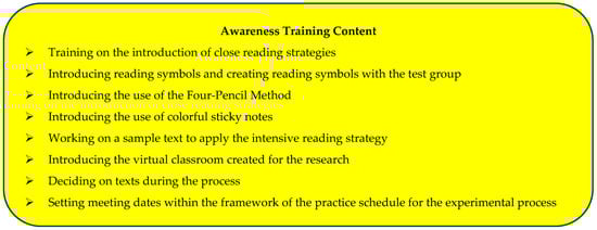 Prior to practice, students in the test group were informed about the research. Participants were divided into groups and were asked to choose group names to facilitate the feasibility of the close reading strategy. The group names selected by the participants were Mars, Venus, Uranus, Jupiter, Pluto, and Mercury. Subsequently, pre-tests were administered, followed by awareness training in the close reading strategy. This training provided the necessary skills for using the strategy in the reading process and was delivered through practical practices. The content of this training is shown in Figure 2.
